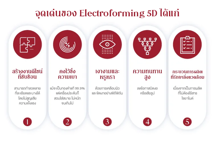 - ทองคำแท้ 99.9% ที่ผ่านเทคนิค Electroforming 5D ทำให้มีความเบา โปร่ง แต่ยังคงความแข็งแรง
