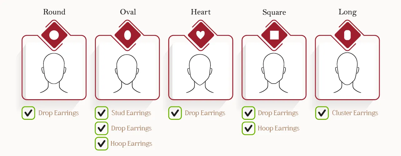 ที่มีความยาวพอสมควร ซึ่งจะช่วยดึงสายตาในแนวตั้งและสร้างสมดุลให้รูปหน้า ควรหลีกเลี่ยงต่างหูแบบวงกลมใหญ่หรือ Hoop ขนาดหนา เพราะจะยิ่งเน้นความกลมของใบหน้า