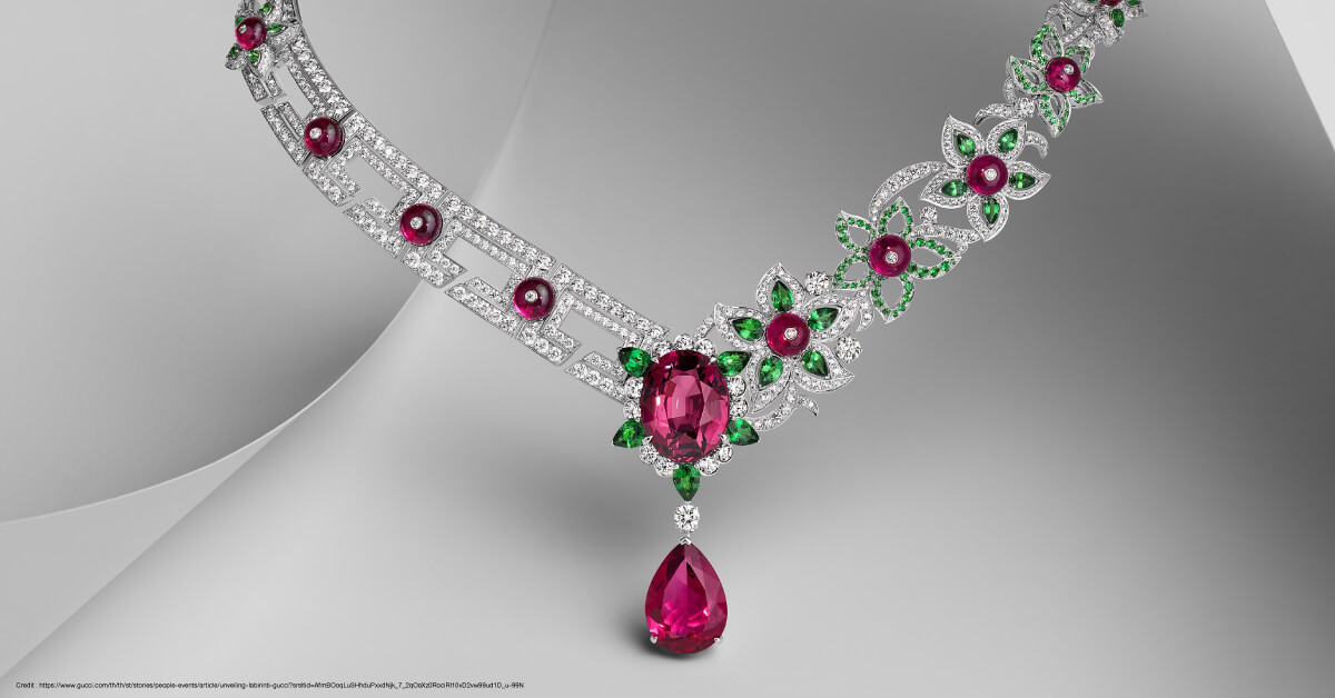 Gucci ผสานศิลปะและแฟชั่นเข้ากับเครื่องประดับในคอลเลกชัน “Labirinti Gucci” โดยเลือกใช้ Paraíba Tourmaline Fancy Sapphire และ Diamond ในดีไซน์เรขาคณิตแบบ เขาวงกต ในคอนเซ็ปการเดินทางที่ผ่านความซับซ้อน มาสู่ความสวยงามของความสมมาตร ความงามอันเป็นระเบียบของทรงเรขาคณิต และความเบ่งบานของธรรมชาติ เป็นแรงบันดาลใจในการออกแบบของ คอลเลกชันนี้